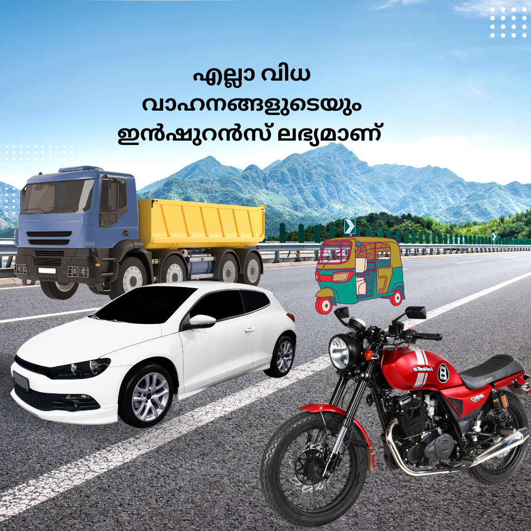 എല്ലാ കമ്പനികളുടെയും 2 , 3 , 4 വീലർ, കോമേഷ്യൽ വാഹനങ്ങളുടെ ഇൻഷുറൻസ് മിതമായ നിരക്കിൽ ലഭ്യമാക്കുന്നു.